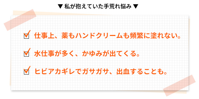 水仕事が多くなるとかゆみも出てくるのに、仕事中はお客様の髪にくっつくので薬もハンドクリームも頻繁に塗れませんでした。